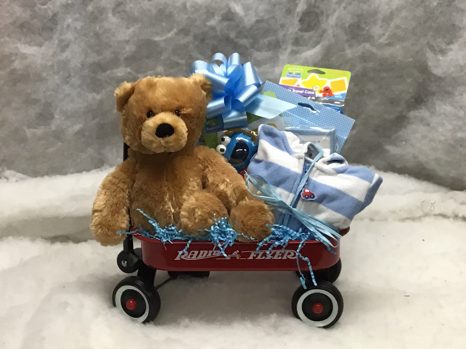 Little red wagon includes a stuffed teddy bear (or other stuffed animal), outfit, first year milestone stickers, hand print canvas, baby wipes holder, and a box of disposal diaper bags.