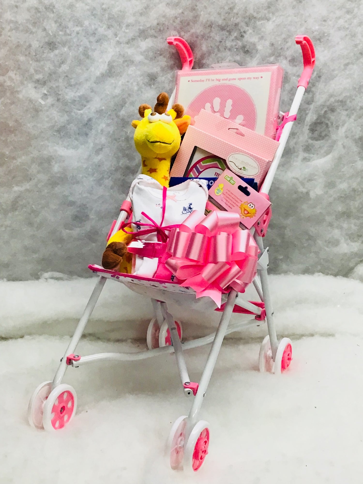 Adorable doll stroller brings with it a stuffed animal, two piece outfit, bath time book, milestone stickers, canvas hand print and disposable placemats.