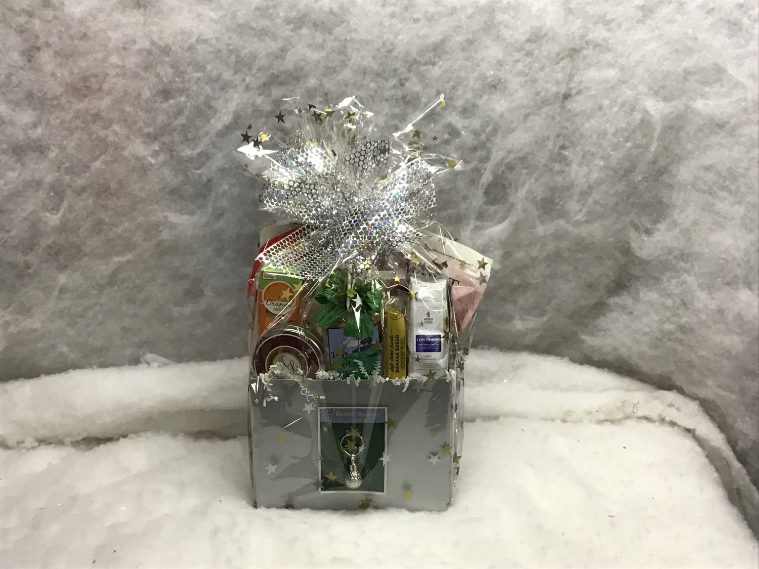 Filled to the brim with treats starting with golf snack mix, golf key chain, popcorn, cheese crisps, assorted dried fruits, flavored coffee, biscotti, cookies, flavored taffy, pecans, merlot cheese spread and crackers.