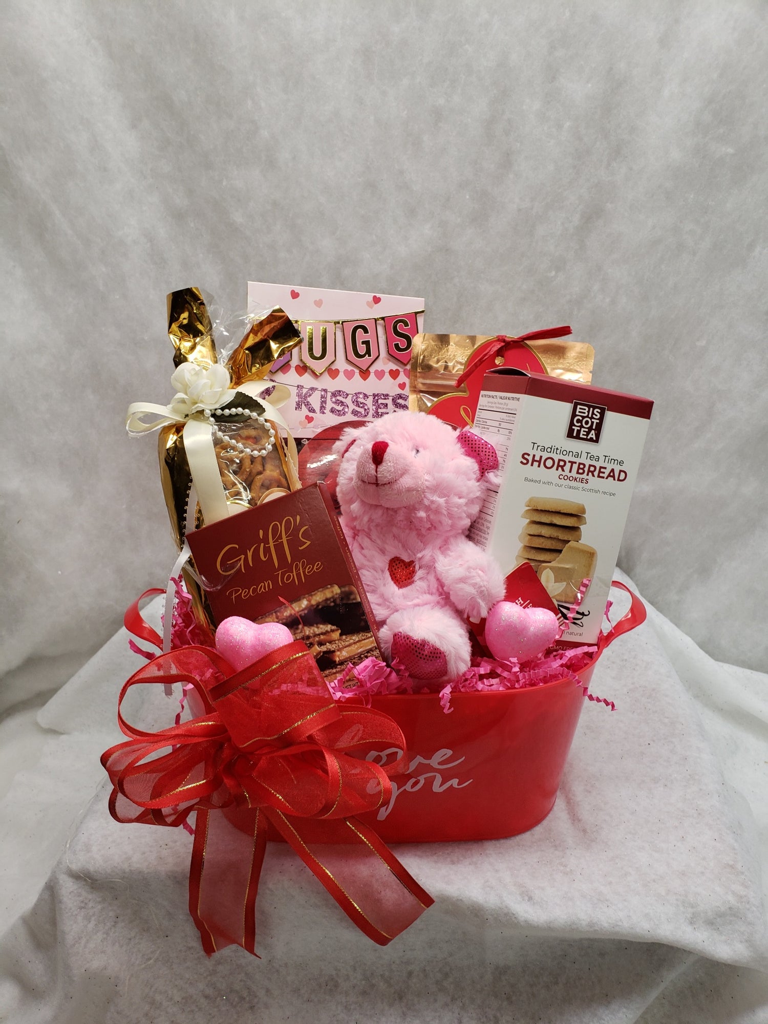 This cute LOVE YOU container holds all the sweets that any girl, no matter the age, would love to receive. Starting with a Heart Shaped Box of Assorted Chocolates, English Toffee, Love You Snack Mix, Shortbread Cookies, Jelly Candy Hearts, Dark Chocolate Covered Almonds and of course a cute stuffed animal. Any basket can be custom made to order.