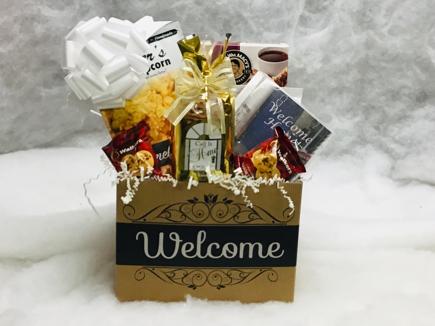 This welcome box is filled with delicious treats to welcome someone into their new home. Let’s start with a Welcome CD with relaxing music, Welcome to Your New Home snack mix, cheese sticks, cinnamon sticks, pretzels, creamy fudge, shortbread cookies, pop corn and chocolate chip cookies. YUMMY